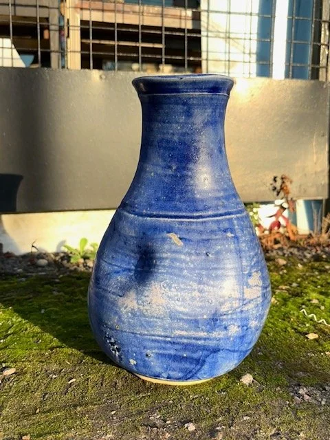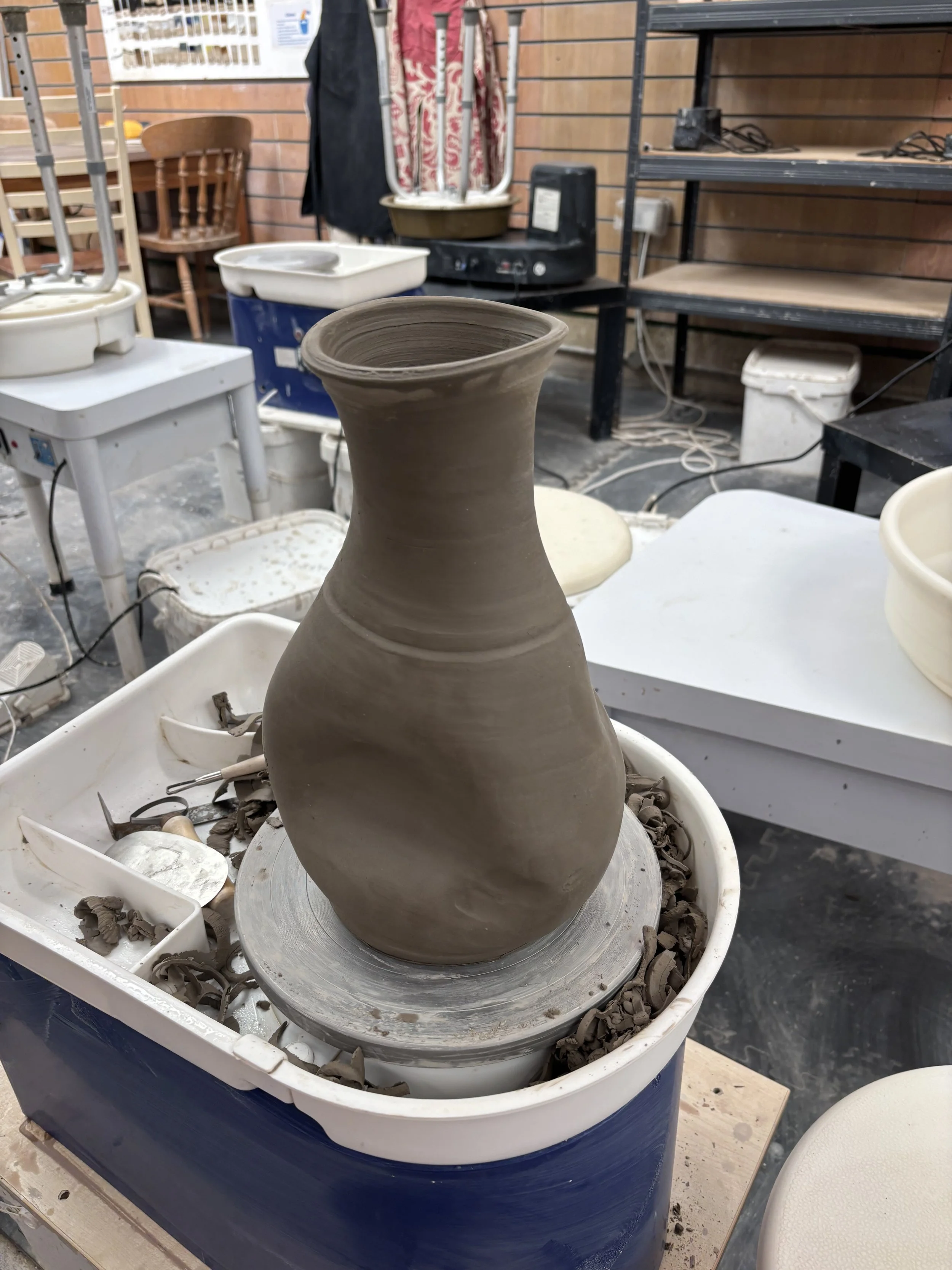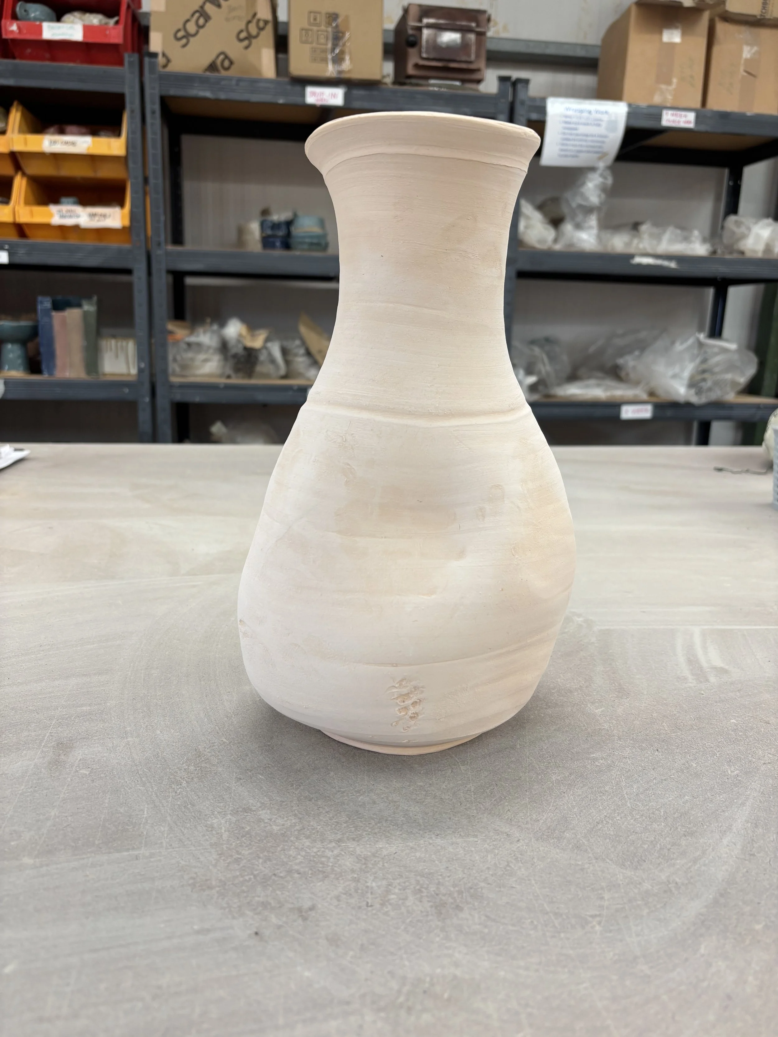 A hand-thrown stoneware vase (approx. 25–40 cm) prepared for hugging